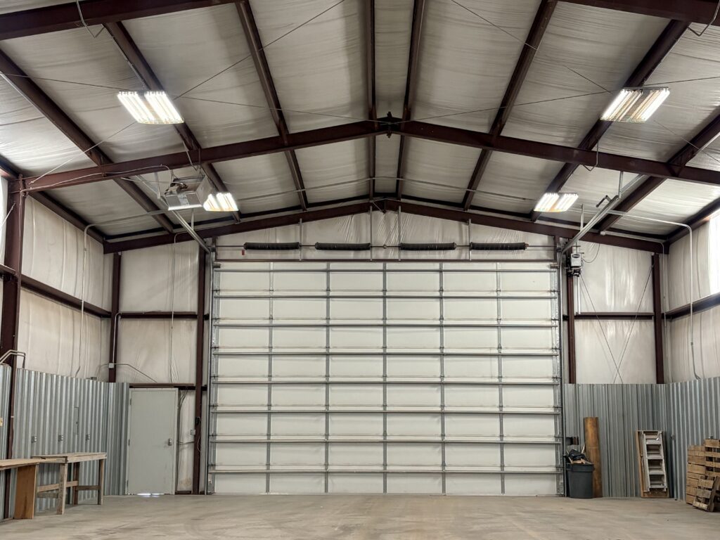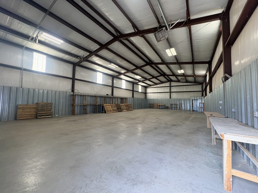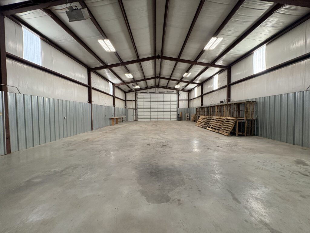 The shop is equipped with electricity (including 220-volt), water, heat, and a commercial overhead door, making it ready for a variety of uses.